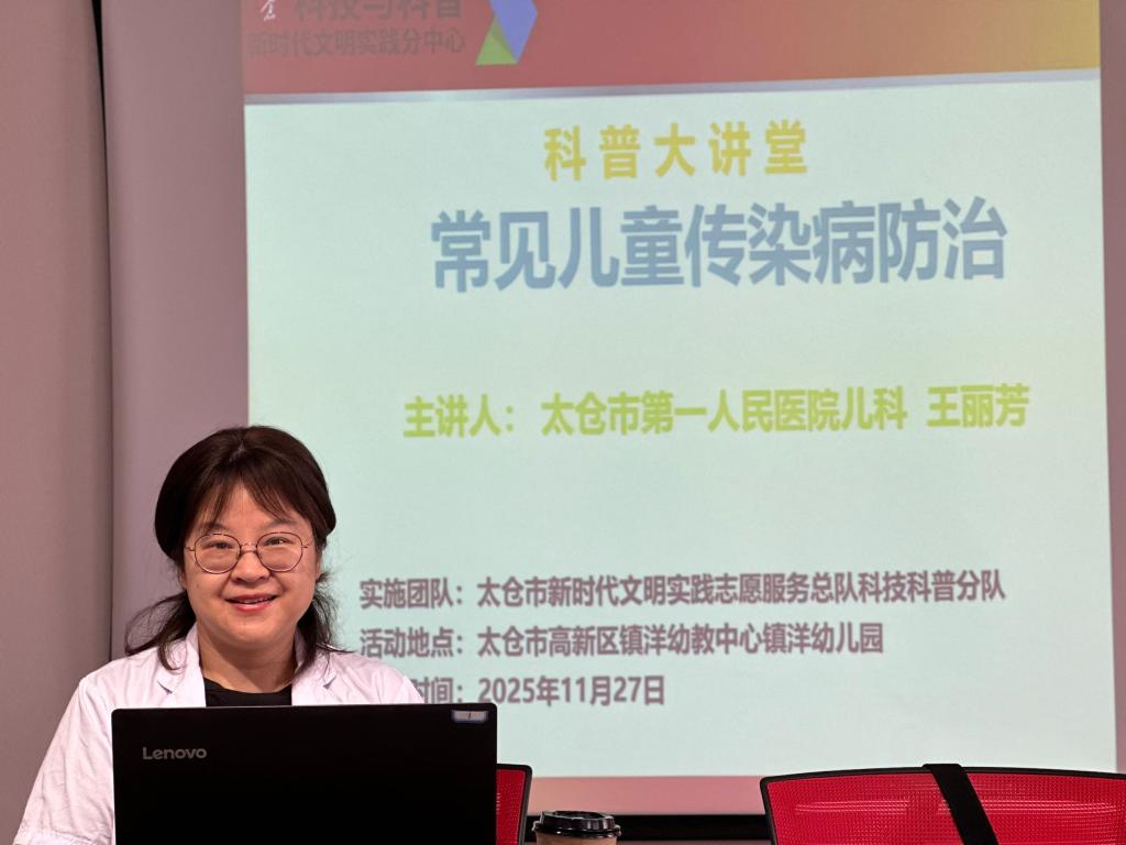 2025 年 11 月 27 日,太仓市高新区镇洋幼教中心镇洋幼儿园特邀太仓市第一人民医院儿科主任医师王丽芳,开展 “常见儿童传染病防治” 科普讲座,幼儿园教职工及家长代表参与。