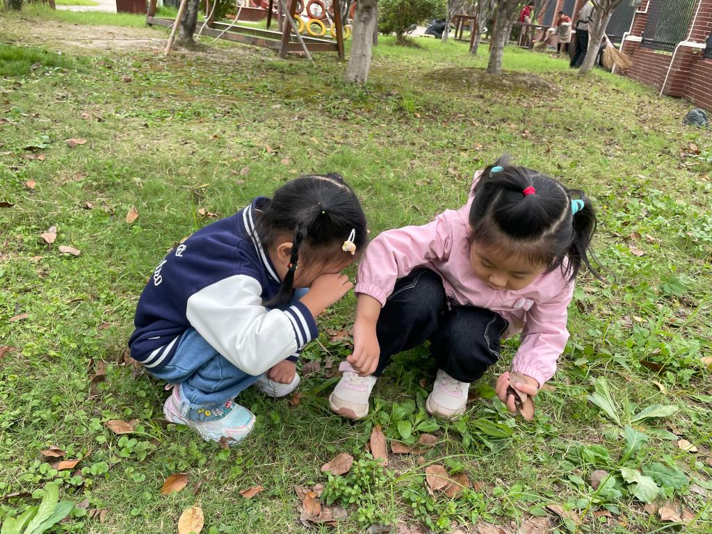 今天的晨锻是在小树林活动,然然和小亦在跑动中,脚下传来“咔嚓咔嚓”的清脆声响。这声音吸引了她们,然然率先停下,惊奇地指着地面:“你看!地上全是树叶,有的碎了!”她小心翼翼地捡起一片边缘卷曲的棕色枯叶,轻轻一捏,叶子便发出轻微的碎裂声。小亦也蹲下身,她没有去捏,而是用指尖轻轻拂开表层的叶子,像是在寻找宝藏。“这片是棕色的,”她举起一片完整的树叶,对然然说,“你的碎了,我的没有。”两个女孩的探索之旅就此展开。然然似乎对声音更感兴趣,她专挑干燥的叶子踩,并侧耳倾听那“咔嚓”声,脸上洋溢笑容。小亦则更像一个严谨的收藏家,她拒绝那些破损的叶子,只收集自己认为最漂亮、最完整的,并仔细地将它们一片片平放在自己手上。她们时而分享自己的发现,时而又沉浸在自己的世界里。