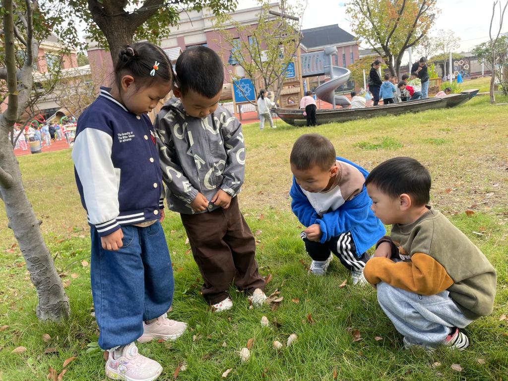 户外晨锻时,小亦首先在小树林的草地上上发现了几个白色的野生菇。她兴奋地指着喊道:“快看!鸡腿!”小安和小翊闻声跑来,好奇地蹲下围观。小亦伸出手指,小心翼翼地碰了一下蘑菇的伞盖,立刻缩回手,并转头对同伴说:“不能吃哦。”小安则用一根小树枝轻轻拨弄蘑菇的根部,观察它的反应。小翊一直安静地看着,当小博想伸手去摘时,他连忙摆手阻止:“脏脏的。”
