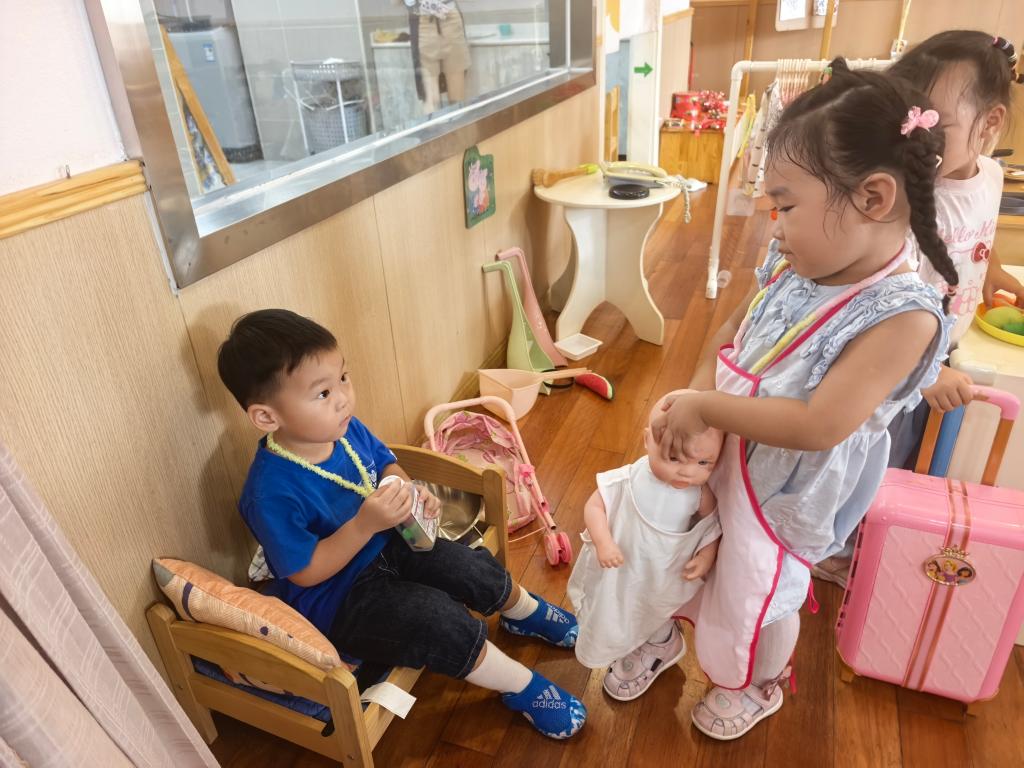 约10分钟后,小然抱着娃娃起身,想将娃娃放到旁边的小床上。当她走到床边时,发现小谦正坐在床沿上,双腿搭在床内,手里拿着榨汁机放在腿上继续 “制作果汁”,床面被小谦占据大半。小然停下脚步,抱着娃娃站在小谦面前,眼睛盯着小床,又看了看小谦,嘴角微微动了动,但始终没有发出声音。此后 1 分半钟内,小然保持站立姿势,偶尔调整抱娃娃的手势,目光在小床和小谦之间切换;小谦每隔 20 秒左右会抬头看小然一眼,停留 2-3 秒后继续低头玩榨汁机,期间未主动与小然说话,也没有起身离开小床的动作。直到区域活动结束铃声响起,两人仍未产生语言交流或互动行为。