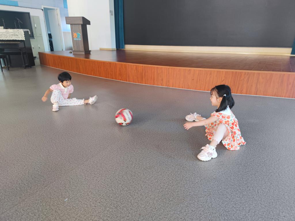 在所有这些尝试中,沐堇和沐睎这一对搭档吸引了我的注意。沐睎,轻轻地说:“沐睎,接住哦!”然后,她用手腕的力量,将球稳稳地推了出去。皮球慢悠悠地滚向沐睎。
