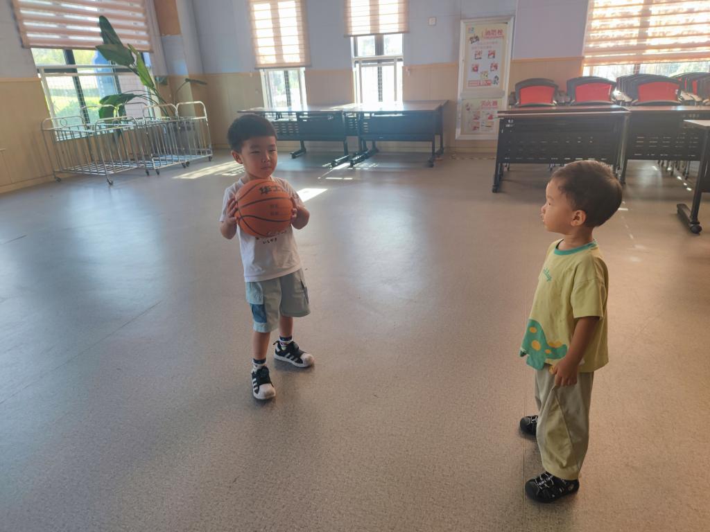 今年的秋日特别的炎热,起床后和孩子们一起在多功能大厅里玩皮球。当我拿出皮球,告诉孩子们:“今天我们要进行一项新的挑战——两两合作滚球!”孩子们听到这个新任务,小脸上都露出了好奇和兴奋的表情。