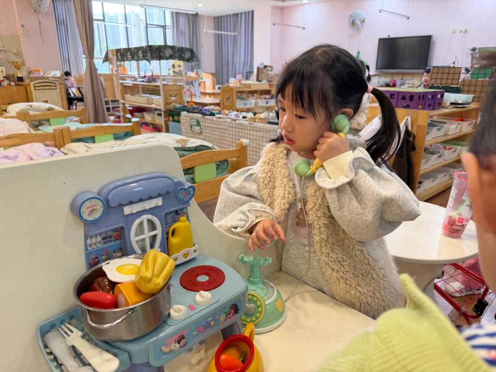 在本次角色游戏中,黄桃和霖霖创设的游戏情境是宝宝发烧了。《指南》中社会领域指出“幼儿的社会性主要是在日常生活和游戏中通过观察和模仿潜移默化地发展起来的”。两位小朋友对于生病和如何照顾生病的宝宝都有一定的生活经验,因此在发现宝宝生病后,他们打算去找医生给宝宝看看,在发现没有医生后,他们选择在家休养,并为宝宝准备药来喝,两位小朋友通过交流、互动共同照顾好了宝宝。