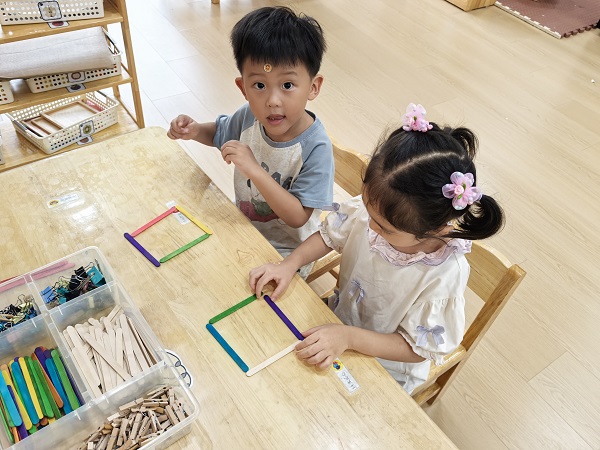 团团拿起夹夹子的玩具,尝试用夹子夹起雪糕棒往高处堆叠,嘴里念叨着:“我要搭一个高高的塔。”在拼图形环节,瑞瑞拼好三角形后,举起来对涵涵说:“你看,我拼的三角形,像小山峰一样!”涵涵完成排序后,也指着自己的作品说:“我排的颜色,一个红一个紫的排。”