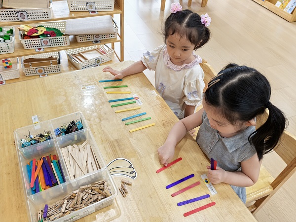 游戏开始后,涵涵看到益智区的雪糕棒和操作卡,兴奋地喊道:“团团、瑞瑞,我们来玩雪糕棒游戏吧!这里有好多图形可以拼呢。”瑞瑞立刻被操作卡上的三角形图案吸引,拿起几根雪糕棒尝试拼接。涵涵则选择了排序操作卡,认真地将不同颜色的雪糕棒按红、黄、蓝的顺序依次摆放。