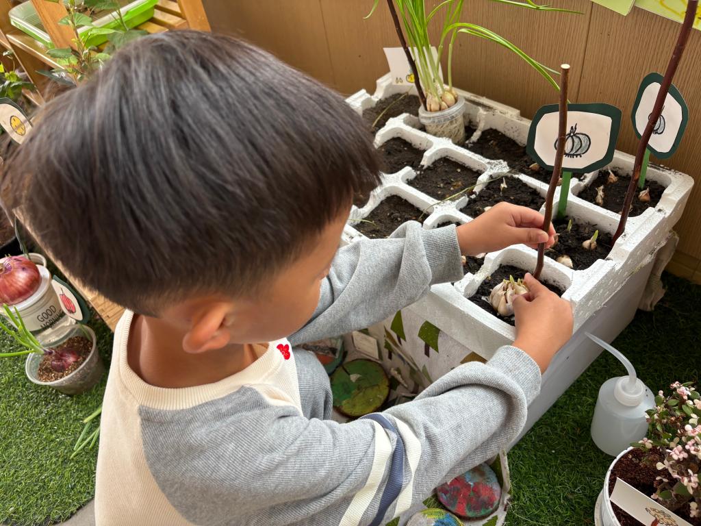 自然角的大蒜苗在孩子们的照料下,已经长出绿油油的嫩苗。今天,砚知被这抹绿色吸引,蹲在盆栽前仔细地看着。