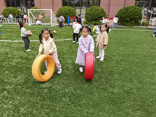 幼儿园以游戏为基本活动,鼓励幼儿积极参与游戏,尊重幼儿在游戏中的表现,引导幼儿积极操作游戏材料,使幼儿在游戏中主动参与、大胆操作,充分体现幼儿在游戏中的积极性、主动性和创造性。作为教师我们要学会尊重儿童、相信儿童,在游戏中发挥教师的主导作用,在游戏中体现幼儿的自主性。在户外活动时间,教师简单介绍材料:“这里有许多的轮胎,请你找好朋友一起来玩轮胎,可以是两个好朋友一组玩,想一想可以怎么玩?”活动开始了,,心心选择了一个轮胎,慢慢的扶起来,想把轮胎拖着走。柠柠看到了说:“心心,我来帮你好吗?”心心说:“好的。”柠柠扶好了轮胎说:“这样拉太重了,我们可以把轮胎滚起来,这样就轻松一些了。心心说:“好的。”柠柠和心心一起推着轮胎慢慢走,心心说:“轮胎滚起来很方面。”她们把轮胎放到了有树荫的地方,坐在了轮胎上。柠柠说:“我们来玩娃娃家游戏吧。心心说:“好的呀!这个轮胎是我们的家。”柠柠和心心在轮胎里表演节目唱歌,柠柠拿来了很多的纸球,说:“心心,这是我们的食物,等一会儿我们来吃。”心心说:“我们放在轮胎里,请好朋友一起吃。”心心和子瑜开心的招呼同伴一起来玩游戏。柠柠想到了趴在轮胎上锻炼身体,柠柠说:“你看,我在游泳呢。”心心说:“你看我也会的。”两个孩子尽情的玩着轮胎游戏。旁边的孩子也和她们一样在轮胎上玩着各种有趣的游戏。