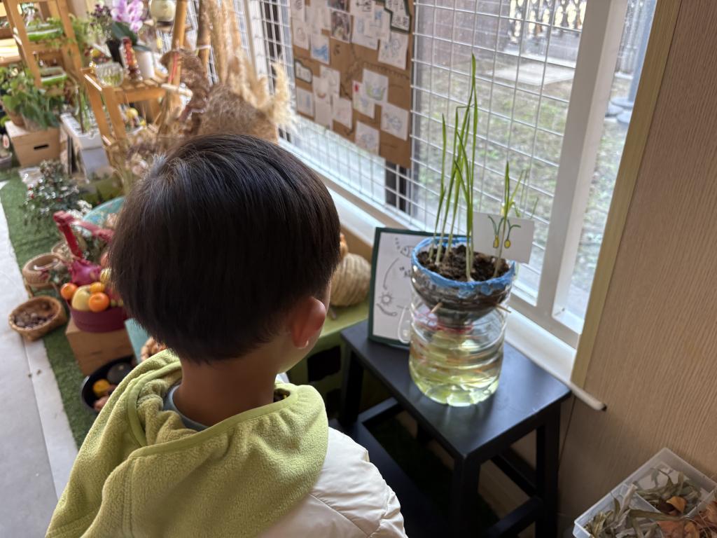 自然角的“鱼菜共生”系统前,砚知已经专注地观察了好几天。砚知发现:一个分为上下两层的塑料瓶,上层是种着大蒜的湿润土壤,下层是清水。他提出疑问:“为什么这里的小鱼不需要喂食?大蒜也不需要浇水呢?”