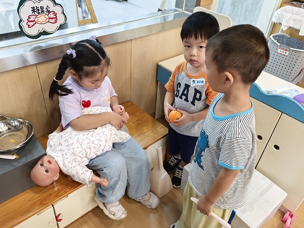 师可以用语言引导幼儿,手抱娃娃问:“今天娃娃家来了一个小宝贝,谁愿意当妈妈照顾它,当爸爸给它做午饭?引导幼儿交流角色。师再启发幼儿:“那妈妈要记得给娃娃盖被子、哄它睡觉,爸爸要去厨房做香香的饭,哥哥可以陪娃娃玩玩具哦!”
