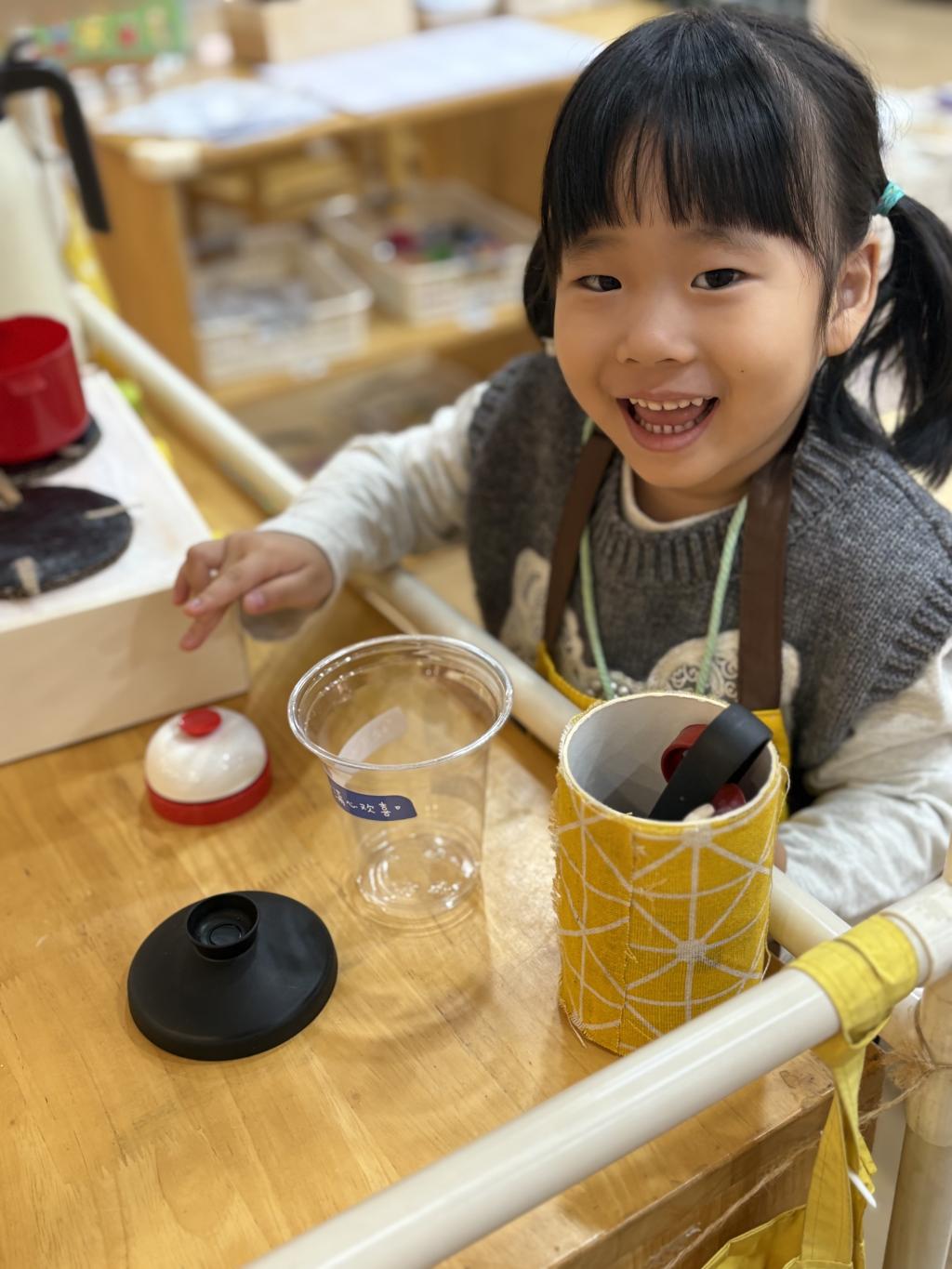 这时,幼儿桐语走进来,指着奶茶问:“我想要一杯奶茶。” 可可立刻放下水壶,双手放在身前,笑着说:“你要热的还是凉的呀?” 桐语说:“热的。” 可可点点头,拿起 加热壶对着杯子晃了晃,接着用小吸管包装纸在杯子上贴了个小贴纸,递过去说:“你的热奶茶做好啦!” 桐语接过杯子后,可可还拿起旁边的小铃,代表奶茶做好了。之后,幼儿朵朵过来想买奶茶,可可发现珍珠快用完了,她跑到小超市,抱着一筐珍珠回来,途中不小心掉了几颗在地上。她停下脚步,蹲下来用小手一颗一颗捡起来, 捡完后继续回到岗位,帮朵朵制作奶茶。