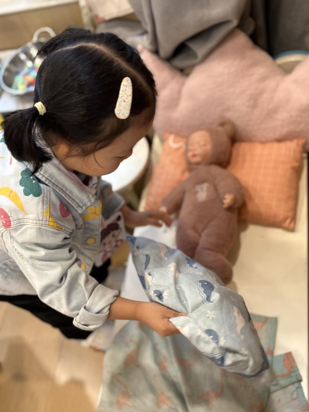言知进入娃娃家后,迅速抱起一个娃娃,轻轻拍着说:“宝宝别哭,妈妈在这里。”她先从旁边的小柜子里拿出一个小奶瓶,装作冲奶粉的样子,一边摇晃一边说:“奶粉冲好啦,宝宝快来喝。”接着,她小心翼翼地把奶瓶递到娃娃嘴边,模仿喂奶的动作。过了一会儿,她发现娃娃的“衣服”有点脏,便从衣柜里拿出一件干净的小衣服,试图给娃娃换上。在换衣服的过程中,她不小心把娃娃掉在了地上,赶紧捡起来,紧张地看了看四周,发现没人注意后,松了一口气,轻轻拍了拍娃娃说:“宝宝不怕,妈妈不是故意的。”然后更加小心地继续给娃娃换衣服。换好衣服后,她又抱着娃娃在娃娃家里走来走去,哼着哄娃娃睡觉。