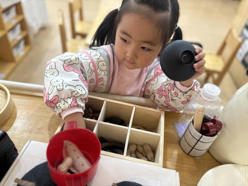 桐语在角色游戏开始后,选择了感兴趣的美食店。她先是挂好小牌子,然后就开始准备材料接待小客人。