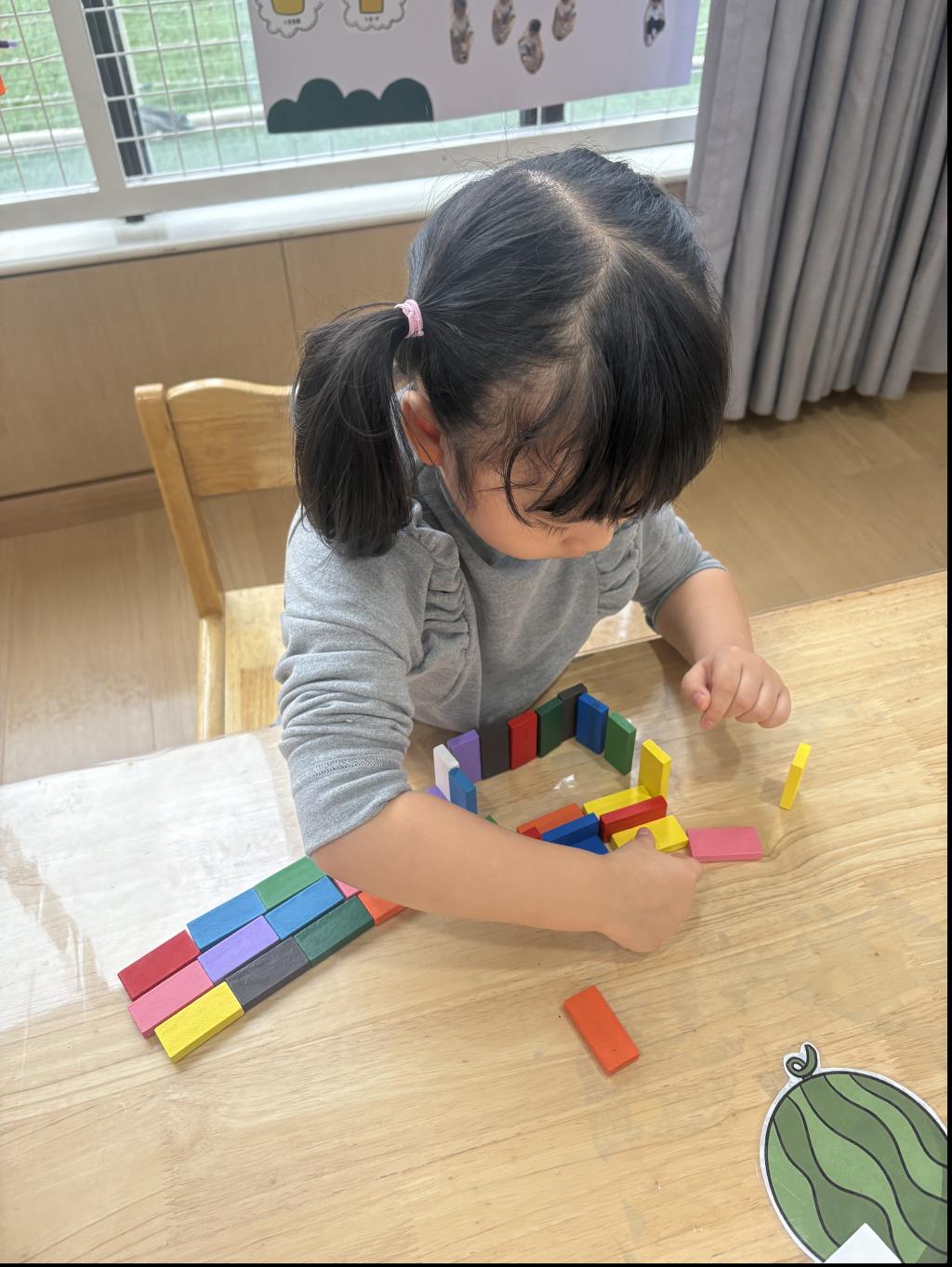 在来园后,可可对多米诺有很大的兴趣,她先是仔细地挑选了一些颜色各异的骨牌,然后开始小心翼翼地将骨牌一块一块地排列起来。在排列过程中,她全神贯注,眼睛紧紧盯着骨牌,双手轻轻放置,确保每块骨牌之间的间距适中。