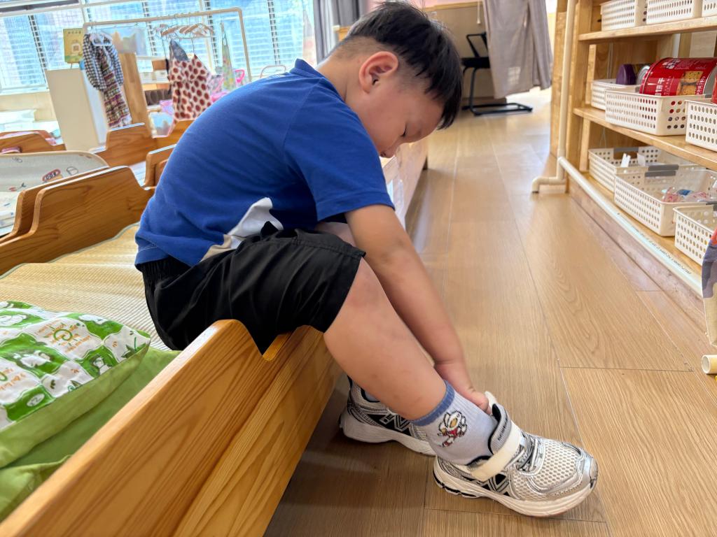 浩浩坐在了床边上,开始试着把脚伸进鞋子里,但是鞋子的扣子没有打开,浩浩试了很多次以后也没有将脚成功穿进去,这时候我指了指鞋子上的扣子说:“宝贝,你试试把这个扣子解开。”浩浩听完后用手把鞋子的扣子解开,然后一只手捏住后面的鞋跟,然后试着将脚伸进去,第一次没有成功。浩浩没有放弃继续尝试着,这时候浩浩站了起来,继续将脚伸进鞋子里,但是还是没有成功,浩浩显得有点着急,浩浩又尝试了几次,还是没有成功,于是浩浩又坐了下来,尝试拉了拉前面的鞋子,然后试着将脚伸进去,这次浩浩成功了,浩浩成功将一只脚穿进了鞋子里,穿好后浩浩将鞋扣扣好了,然后浩浩又用同样的方法穿另外一只脚。只见浩浩先打开鞋扣,然后站着将脚伸进去,再将鞋扣扣好,这次浩浩用时比较短就完成了穿鞋子,穿好鞋子后浩浩很开心。