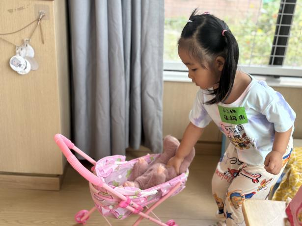 进入娃娃家后,桐语在娃娃家当妈妈,正好在哄宝宝睡觉,烁烁扮演爸爸。烁烁首先走到小厨房,弯腰从篮子里拿起食材,转身递给桐语。随后,他就跑到柜子边,踮起脚尖,把蓝色的小锅从柜子上层拿了下来,放在“灶台”上。桐语放下摇篮车,接过蔬菜,走到旁边的水池前,模仿着大人洗菜的动作,把蔬菜在盆里来回涮了涮,嘴里还念叨着:“洗干净,洗干净。”