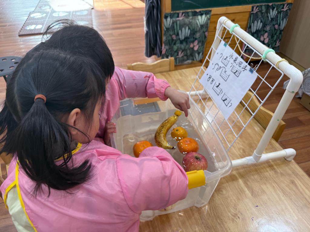 在后续的游戏中,可以丰富探究材料,增加圣女果、猕猴桃、塑料块、石头等不同材质物品,引导幼儿对比观察。另外还可以开展集体分享活动,通过提问“为什么有的水果浮起来,有的沉下去?” 启发幼儿深入思考,同时提供放大镜、托盘等工具,支持幼儿进一步探索水果轻重、大小与沉浮的关联。