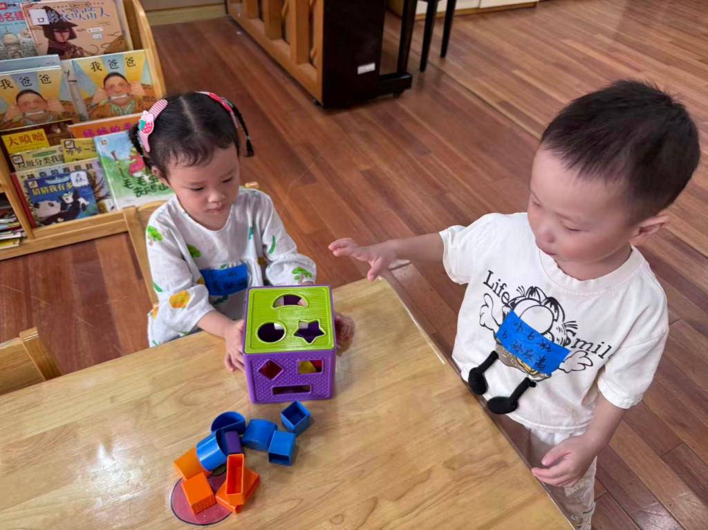 益智区活动中,小7和嵩嵩一起来到益智区玩立体形状配对玩具。玩具为一个正方形盒子,上面有多个不同形状的孔洞(如圆形、方形、三角形、星形等),配有相应形状的立体积木。