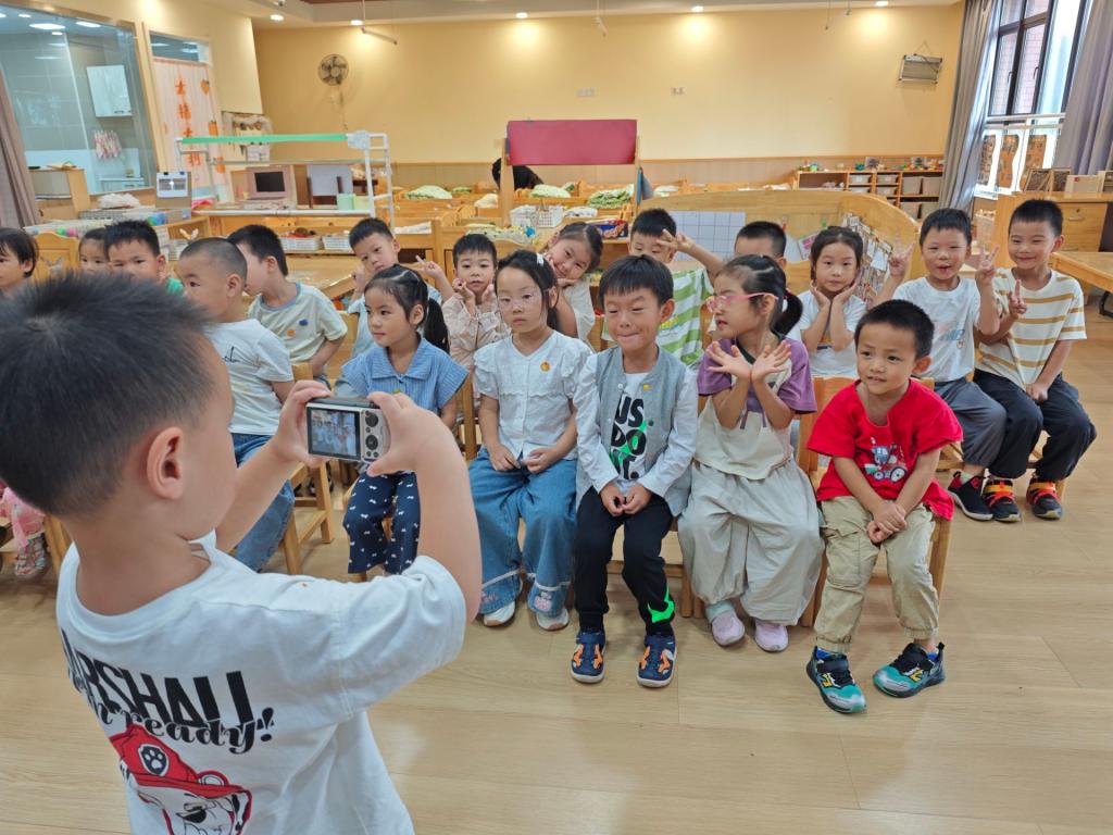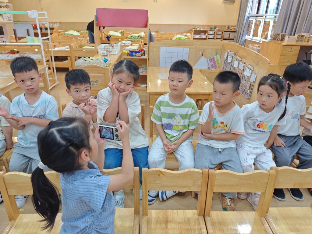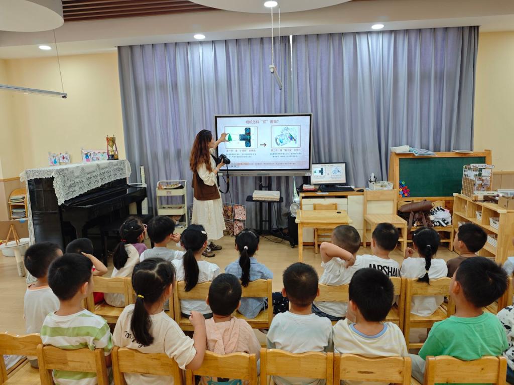 她先通过猜谜语的方式拉近距离,再结合PPT里的“小伙伴”板块,用“小帽子”比喻镜头盖、“小手链”形容挂绳,教孩子们认识相机构造;还利用图片介绍了光线如何穿过镜片“抓”住画面,把抽象原理变得直观。互动环节中,孩子们先用小手比出“相机”玩模拟拍照游戏,随后杨施屹妈妈又拿出拍立得,手把手教大家握相机、找角度,当带着笑脸的照片慢慢显影时,孩子们欣赏着照片互相讨论,满是欢喜。
