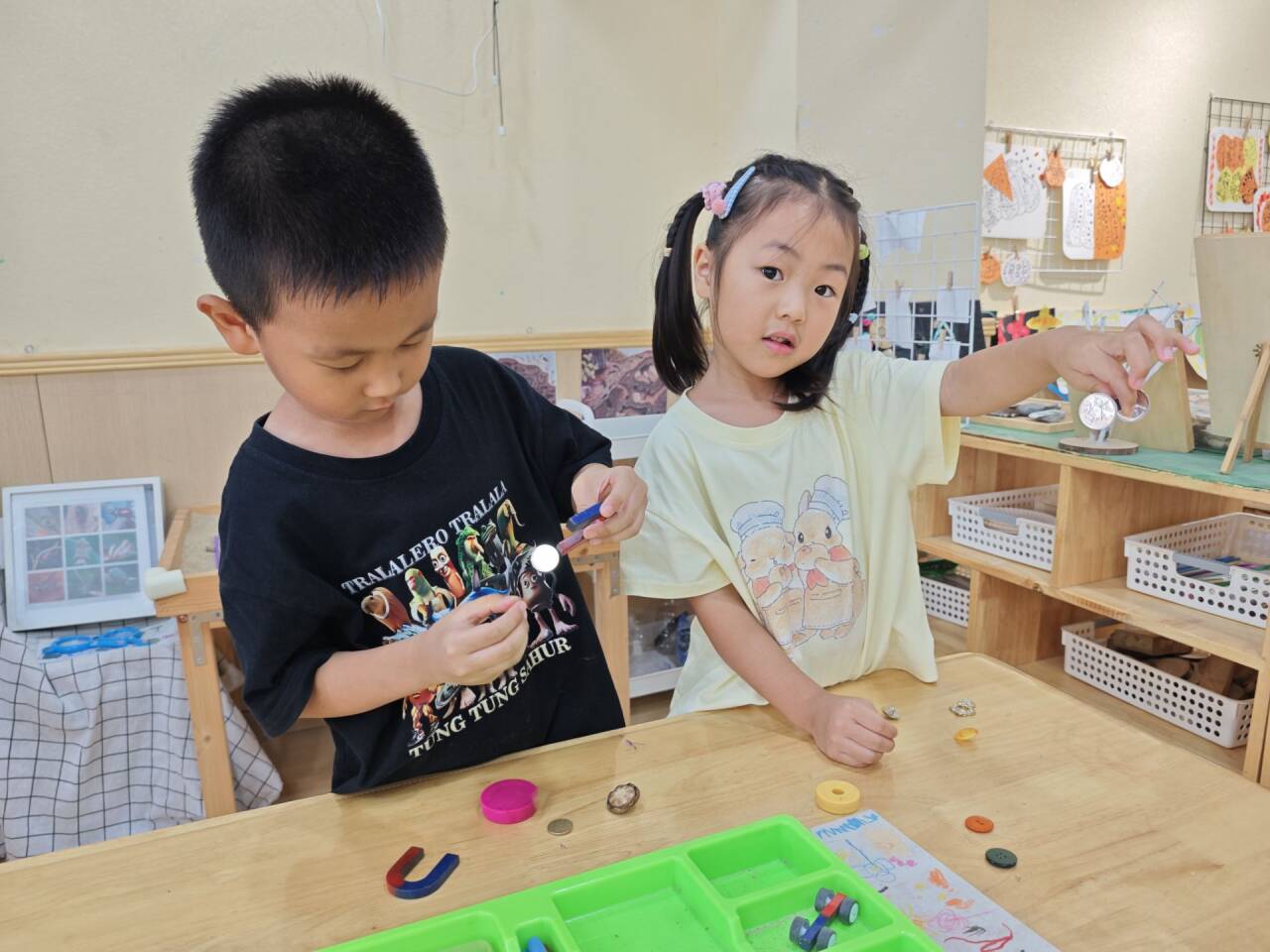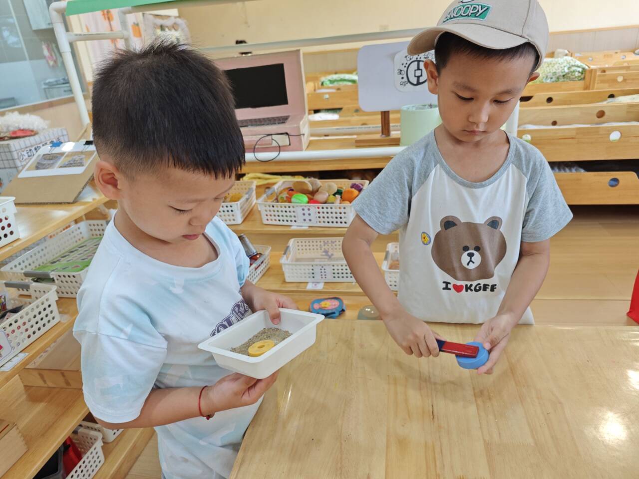 孩子们你一言我一语,把探索到的磁铁秘密和同伴交流着,这场关于磁铁的奇妙探索,已经在他们心里种下了科学的小种子。