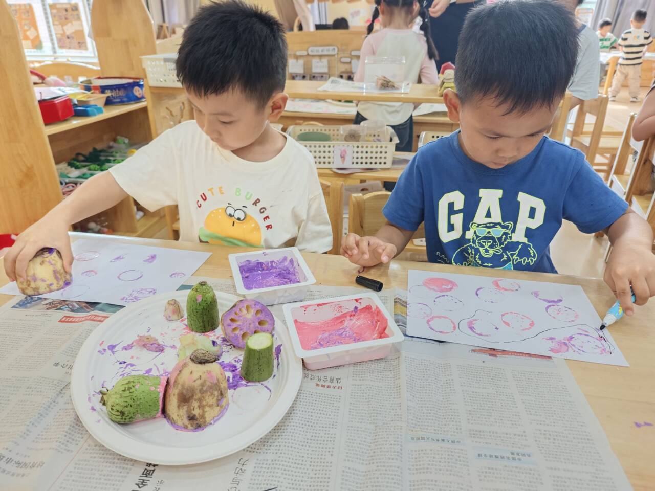 美工区里,刘刘和恩恩正握着切开的莲藕和丝瓜段蘸着自己喜欢的颜料,在白纸上轻轻一按,一朵粉色小花立刻绽放。“我用芹菜试试!” 恩恩拿起切好的芹菜段,蘸上紫色颜料拓印,根部组成的花纹清晰地印在纸上。另一边,萌萌和同伴们忙着做 “一篮子的蔬菜”,他们把紫色彩纸撕成茄子外形的样子,将蓝色的纸撕成长条,装饰篮子。再用胶水小心翼翼地贴在篮子的底板上,不一会儿,满满一篮 “蔬菜” 就做好了。