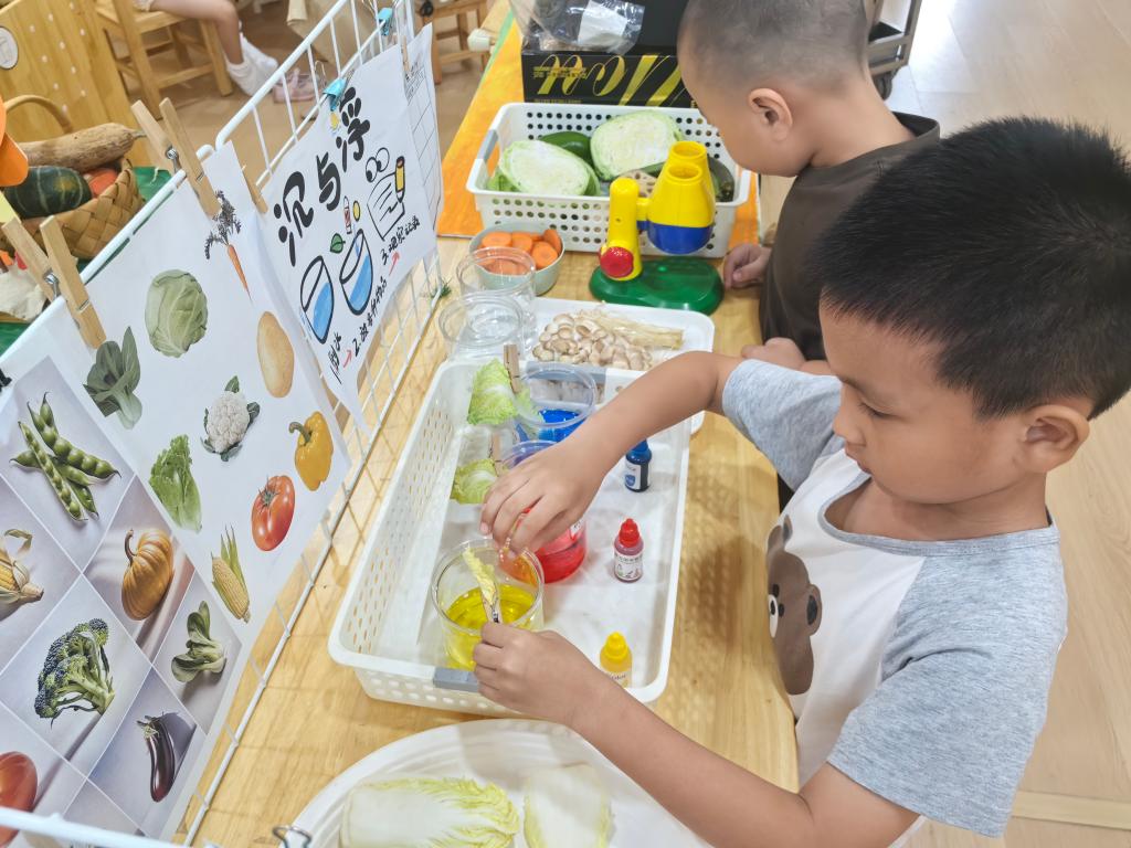提供放大镜、实验记录纸,引导他细致观察叶脉变化并记录实验过程,培养科学观察与记录习惯。以开放性问题引导深度思考,如“两种颜色染料混合,白菜会变什么色?”激发探究思维,同时延伸至“沉与浮”实验角,关联不同科学现象拓展探究广度。