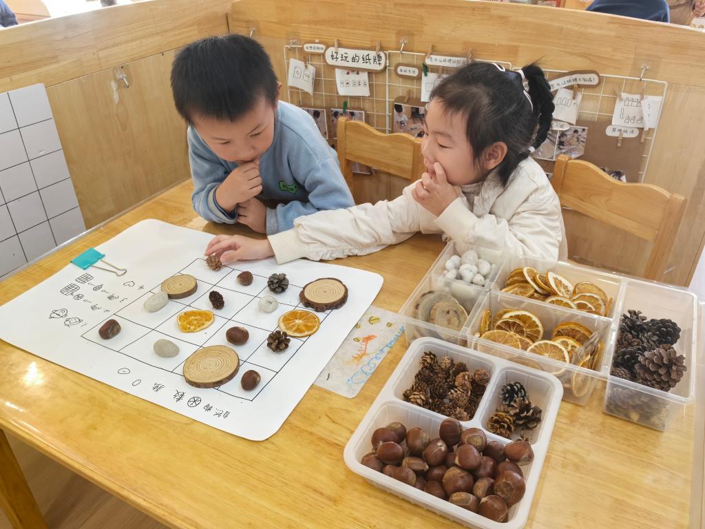 今天区域活动时,佳佳和一一主动选择了自然物数独——棋盘是画有网格的白纸,材料是松果、木片、橘子干、坚果等自然材料,规则是“每行每列不重复”。游戏开始,一一先拿了颗松果放在第一行,佳佳跟着放了块木片,却没注意同一列已有木片。一一立刻指着格子提醒:“这里已经有木头啦!”佳佳愣了愣,拿起木片换成橘子干,小声说“我忘了”。随后两人逐渐进入状态:一一习惯先观察整行整列再放材料,会把不同种类的自然物分开放在手边;佳佳则更依赖“试错”,放错了会吐吐舌头,自己快速调整。中途,第五行出现了“坚果、松果、橘子干”重复的情况,两人同时皱起眉。一一用手指着格子数:“这里有松果,这里也有……”佳佳突然拿起一颗石子“用这个代替!”两人尝试后发现石子能填补空缺,顺利完成了这一行,还相视一笑。