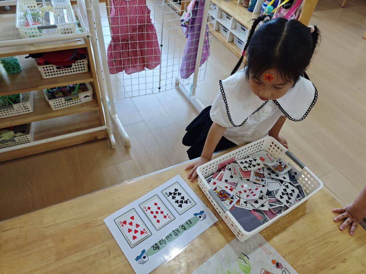 第三组的孩子,他们把纸牌按花色分类,然后开始根据题卡,进行不同花纹间的排列,陈陈看着题卡上画着:黑桃红桃黑桃红桃......于是从已经分好类的牌里找出两张黑桃和两张红桃,按照题卡摆好,第五张是?这时琪琪提醒到,第5张是黑桃,第六张是红桃,陈陈于是将纸牌继续排队。在不断调整和尝试中,孩子们慢慢感知着花色的不同规律变化,小眼睛里满是专注。