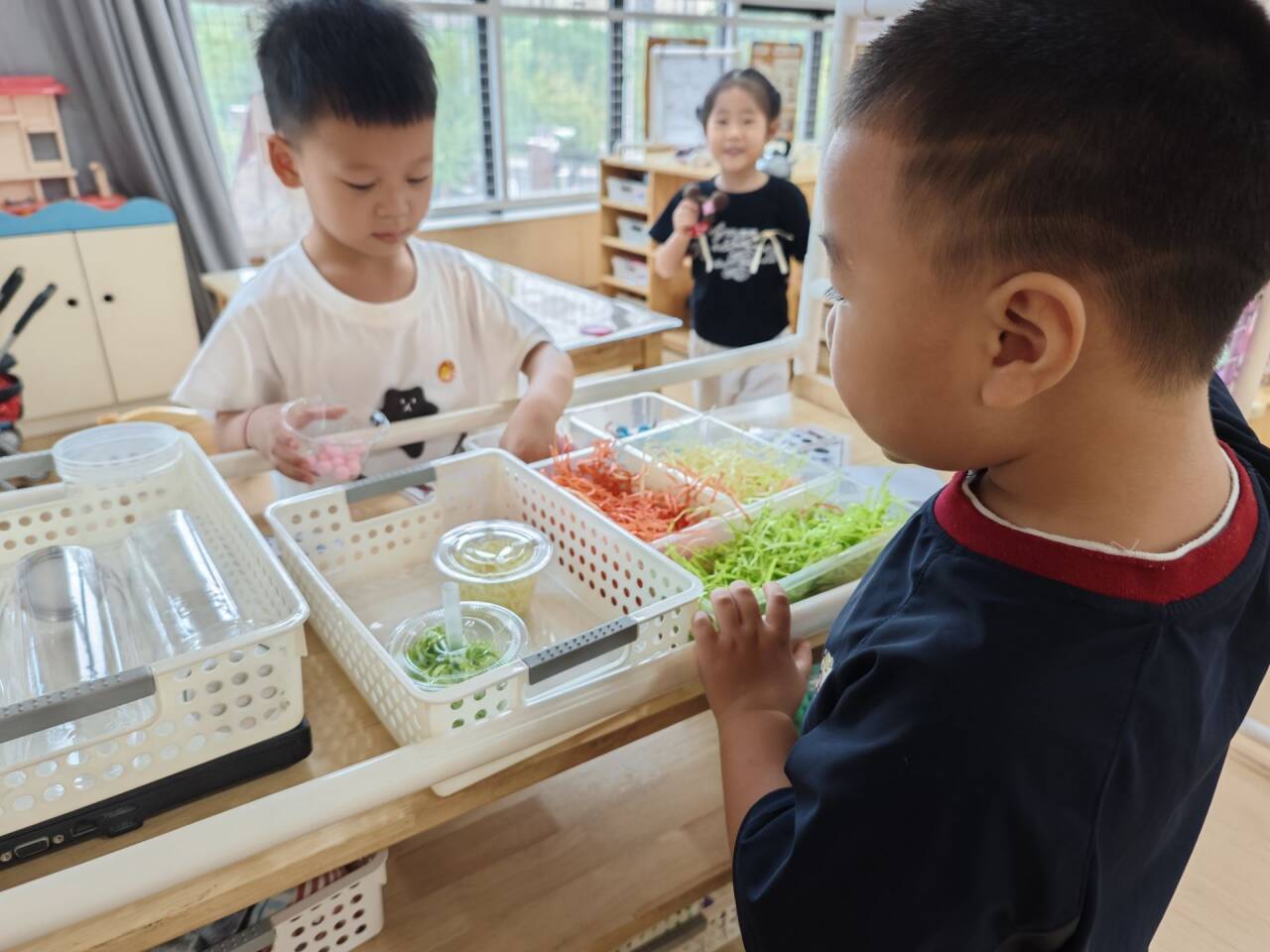 第一天的饮品店生意太好了,8杯小杯的果汁很快就卖完了,第9个顾客来的时候,墨墨为难地说:“抱歉,今天的果汁已经全部售卖完了,欢迎下次再来。”于是第二天的角色游戏时间,墨墨提议:“我们自己做饮料吧,能挣更多钱,而且也能有更多的顾客。”大家立刻行动起来,从材料区找来彩色毛球和不同颜色的拉菲草。墨墨把毛球按照颜色分类,一种颜色装入一个透明格子。施施则将拉菲草也分类,装入另外的透明格子。他们把绿毛球放进空杯子:“这是猕猴桃果肉!用橘色拉菲草缠绕杯壁:“加上南瓜装饰,变成南瓜猕猴桃饮!” 他们还发明了“分层饮料”—— 彩虹饮,把每种颜色的拉菲草依次装入大杯中。