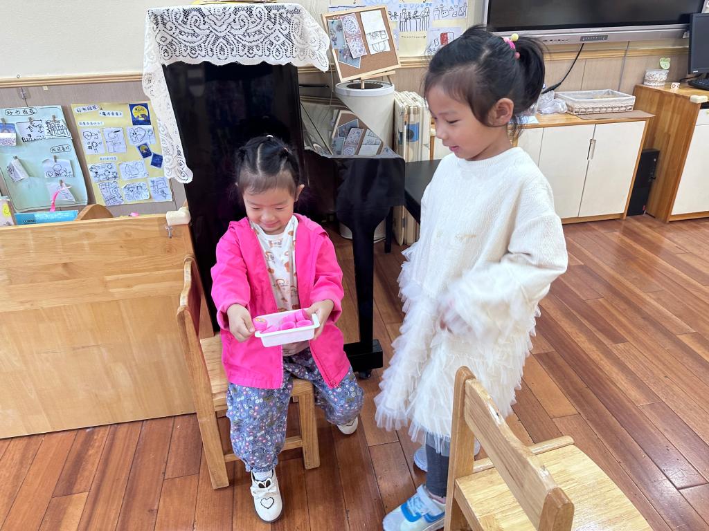 角色游戏时间,越越和桐桐一同来到了电影院区域。越越兴高采烈地说道:“我要当售票员!”桐桐也兴奋回应:“那我来表演节目!”越越开始在材料筐里翻找小纸片,一边找一边嘀咕:“电影票怎么不见了?”找了一会儿没找到,她皱着小眉头,眼神在周围扫视。突然,她看到了旁边放着的瓶盖,眼睛一亮,拍手说:“这个可以当电影票!”接着,她小心翼翼地把瓶盖一个个拿出来,整齐地摆放在“售票窗口”。桐桐则在“舞台”前,一会儿转圈,一会儿模仿小兔子跳,嘴里还念叨着:“看我的精彩表演哦!”越越拿着“瓶盖电影票”,对着想象中的“观众”说:“快来买票看表演啦!”这时,有几个小朋友被吸引过来,越越有模有样地“售卖”着“电影票”,还和桐桐说:“你要表演得更有趣些,这样观众才多。”桐桐用力点头。