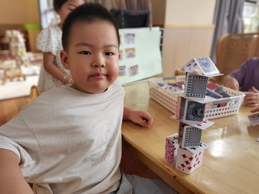 后续支持:引入辅助材料:适时提供纸杯、小积木块等更稳固的材料,建议孩子:“试试看,能不能用纸杯做房子的底座,让你的纸牌房子变得更坚固、更高?” 引导他探索不同材料组合使用的效果。