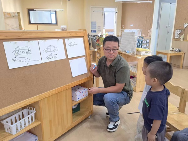 在本次活动中,孙翌阳爸爸先向幼儿大致讲述了一下自己的工作内容。随后又借助绘画的形式,大胆展示了自己的设计作品,孙翌阳爸爸画的小汽车、恐龙等造型,生动形象,赢得了幼儿们的连连称赞!在活动进入尾声时,孙翌阳爸爸又拿出了为幼儿准备的小盲盒,更是让幼儿爱不释手!