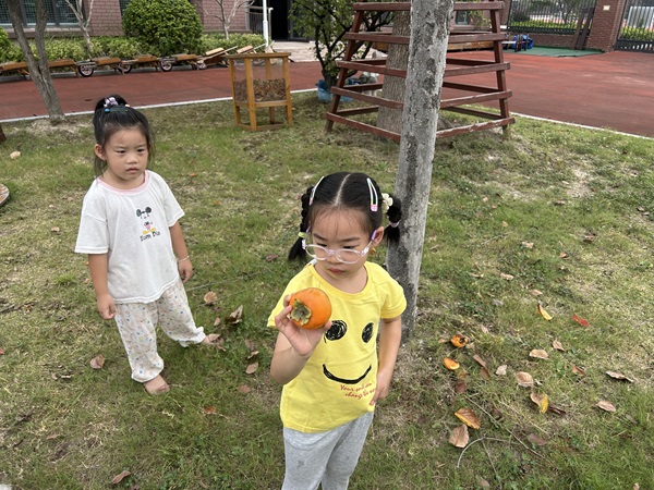 看到歆苒拿到一个小柿子后,其他孩子也眼巴巴地望着树上,期待着小柿子还能“咚”地一声掉下来。也忍不住向我发问:“老师,柿子什么时候才能再掉下来呀?”我告诉孩子们:果实的成长都有一个过程,需要耐心等待。
