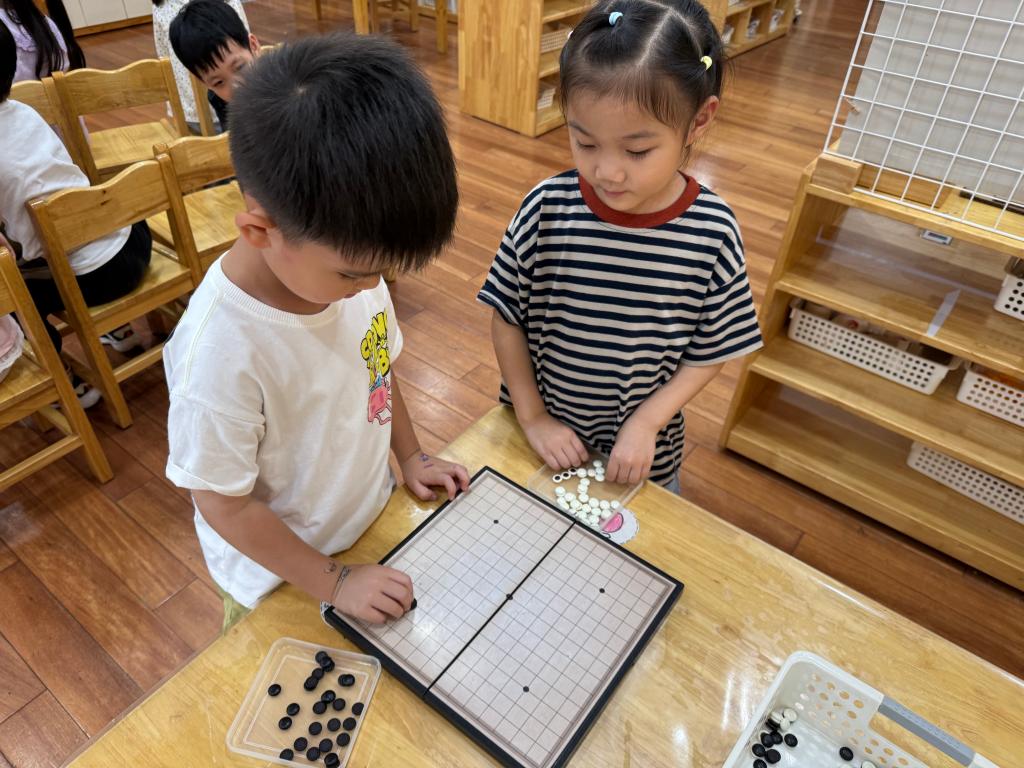 珩珩能主动观察棋路、调整策略,妍妍能尝试“堵棋”,反映出逻辑思维与空间观察能力的萌芽;