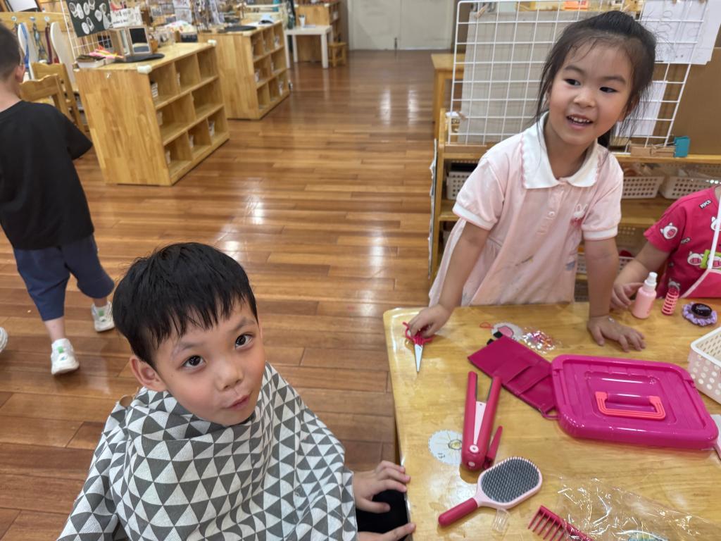 2. 角色扮演能力:两名“理发师”能模仿真实理发流程(洗头、剪发、造型),还加入“说泡泡”“递镜子”等细节,说明对生活场景的观察和再现能力较强。