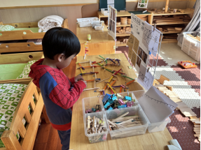 建构区“搭小桥”游戏中,浩浩取来木棒和小夹子,想在两个柜子间搭桥:先将两根木棒分别搭在柜沿,中间用夹子连接,松手后木棒立刻滑落,他皱着眉盯着散落的材料,蹲在桌前摆弄夹子,尝试把三个夹子叠在一起夹木棒,结果还是不稳。