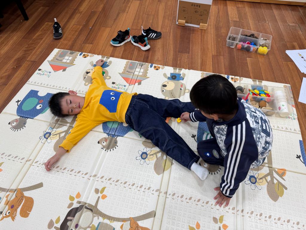 区域游戏开始了,珩珩和浩浩选择了“自然物测量的游戏,浩浩先躺在地垫上伸展肢体,珩珩从材料盒中取出松果、干花等自然材料,蹲在浩浩身边,尝试用干花比对浩浩的小腿长度,嘴里念叨:“这个花花,看有几个。”