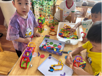 区域游戏开始啦!小朋友们自己选择好自己感兴趣的区域并夹好插牌后,便开始了区域游戏。玹玹和凯凯一起去了建构区,拿出一盒桌面建构材料后,他们开始思考今天搭点什么呢?玹玹说:“我想搭一个高铁,暑假爸爸带我乘高铁出去玩的,高铁可大啦!”凯凯说:“那我搭个房子吧,爸爸、妈妈还有我住在这个房子里。”之后,他们便从框子里拿出了自己需要的积木开始创作。冉冉从旁边走了过来,发现凯凯的房子周围还有一些半圆形的积木,她感觉很奇怪,便问道:“凯凯,你这是什么呀?”凯凯看了一眼自己搭的作品,向冉冉介绍:“这是进房子的大门,我和爸爸妈妈一人一个,这个门是大家都可以进去的。”冉冉思考了一会说:“下次我就从这个大门进来找你玩哦!”他们约定好了一起见面之后,凯凯又独自对房子进行了装饰。随着教师播放收玩具音乐,凯凯收拾完玩具便搬着小椅子回到座位上了。