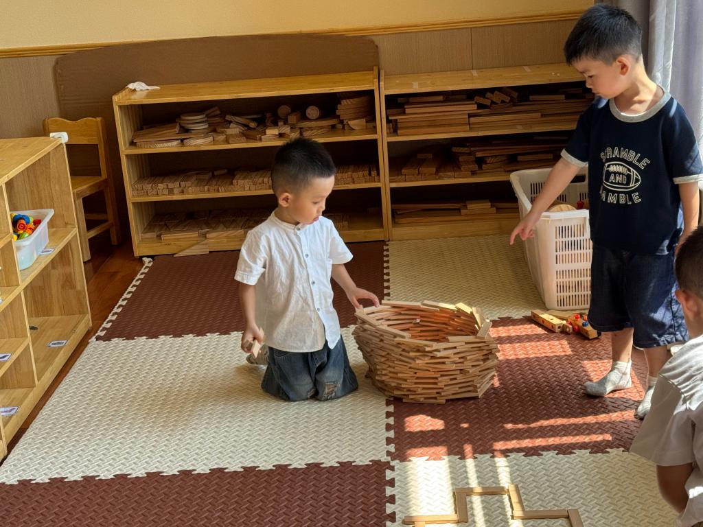于是两人分工,潇潇负责从积木筐里挑选长度相近的卡普勒积木,珩珩则跪在地上,将积木一块接一块地围绕中心摆放,每摆一层就稍微往内收一点。过程中,有几块积木总是错位,珩珩耐心调整,还时不时看看旁边的积木架,似乎在思考结构的稳定性。潇潇看到珩珩的进度,主动递过更多积木,说:“珩珩,我再给你拿些,我们把它搭得高高的。”