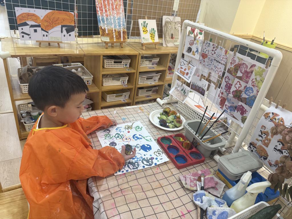 在美工区游戏中,星澄和邹邹选择在蔬菜印画,在印画前,他们去生活区拿了别的小朋友切好的蔬菜,并且在美工区自己调了好了颜料。在开始印画的时候,星澄和邹邹每印一个都会互相看一下,并且笑着说:“你这个像星星,你这个像一朵花”,“你这个像一个人圆圆的头”,没过多久,星澄的纸上就印满了蔬菜的图案,在等待颜料干的同时,星澄找了网格上的一张参考图片,说到:“我也来画这个蔬菜人”,于是在颜料干了之后,星澄在蔬菜印画的图案上添画了头发、手和脚,并且说:“这是会跳舞的蔬菜人”。