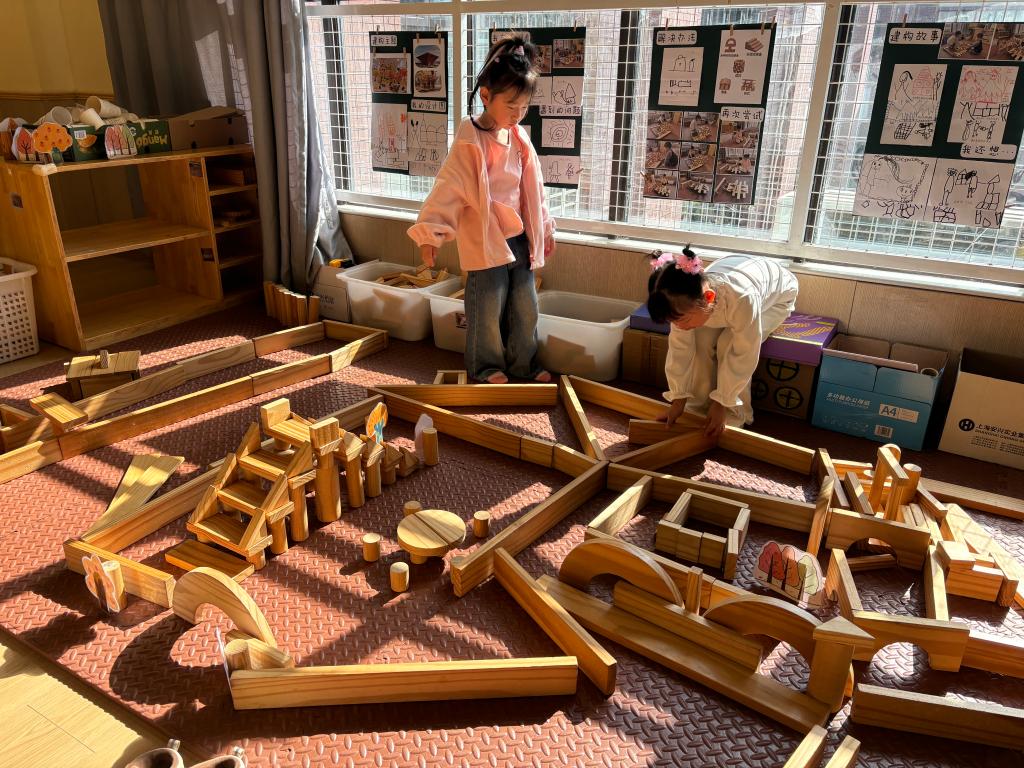 今天妞妞和朱朱在建筑工地当小工人,朱朱拿起长积木铺出地基,妞妞蹲在材料箱旁挑选积木。朱朱双脚站在长积木围成的区域内,说:“这是我们的工地,要建公园!”妞妞抱来圆柱积木,放在地基旁:“这是柱子,要立起来。”妞妞尝试叠高圆柱积木,叠到第3块时倒塌,她皱着眉看向朱朱。朱朱走过来:“要先放一块大积木当底座!”两人一起将长积木平放,再把圆柱积木叠在上面。朱朱拿来拱形积木,试图架在两根圆柱上但长度不够,两人更换短圆柱后,成功架起拱形桥。 妞妞拿来装饰小树,放在建筑旁:“这是工人休息的地方。”两人一起后退看作品,朱朱笑着拍手:“我们的小公园建好啦!”