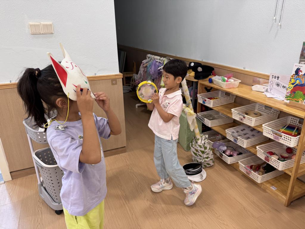 指南在艺术领域指出:大班幼儿能用律动或简单动作表达自己对艺术作品的理解。在表演区中鸣一能够根据音乐声音的轻重来敲鼓,有着较好的音乐素养,鸣一摆放椅子是想邀请观众来欣赏她的表演,但她只是摆放了椅子并没有去邀请观众来看她的表演。鸣一比较胆小,缺乏社会交往的经验。⒈提供符合她们年龄并且幼儿自己感兴趣的歌曲的图谱和节奏谱⒉进行讨论和分享交流,在此基础上师幼共同设计节目单投放到表演区。