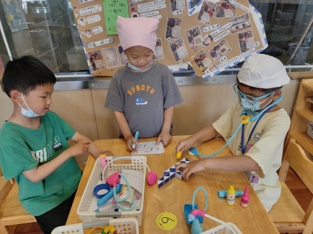 角色游戏开始后,灿灿、明翰、凡凡三个人拿出了小医院的玩具,开始小医院的游戏。灿灿说:“我是吴医生。”凡凡说:“我是黄护士。”明翰说:“我是刘医生。”三个人在桌子上摆放好游戏材料后,就坐了下来。几分钟过去了,没有小客人来到小医院。于是我以病人的身份来到了小医院,我和他们说:“医生,我有点不舒服。”于是明翰举起听诊器给我看了起来,灿灿也凑了过来,检查完之后明翰说:“她好像发烧了,吴医生你给她打一针吧。”灿灿从桌面上挑了挑,拿起针往我胳膊上扎了一针。打完之后,灿灿和凡凡说:“再开点药吧。”凡凡从篮子里拿了两盒药递给了我,说:“每天吃哦。”