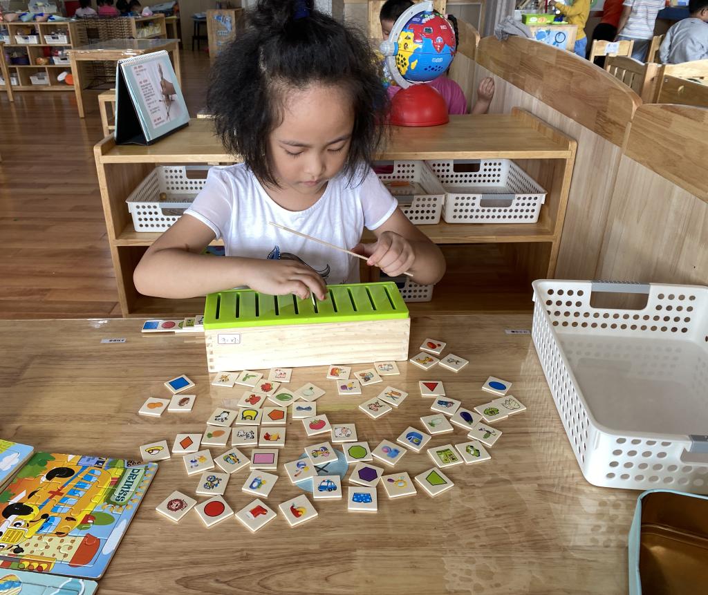 今天活动的时候,小花来到了益智区,她拿出了一款插片式玩具。先是从积木里面拿出一长条的动物指示牌,放到了一边,然后又从桌子上小块的方形片片中拿了一个蔬菜图案的方形片片,塞到了缝中,然后又拿了一个小车图案的方形片片,插到了缝中。过了一会儿,小花拿出了水果长条指示牌,然后在桌子上找到了一些水果的方形片片,把苹果方形片片插到了苹果指示牌那里。