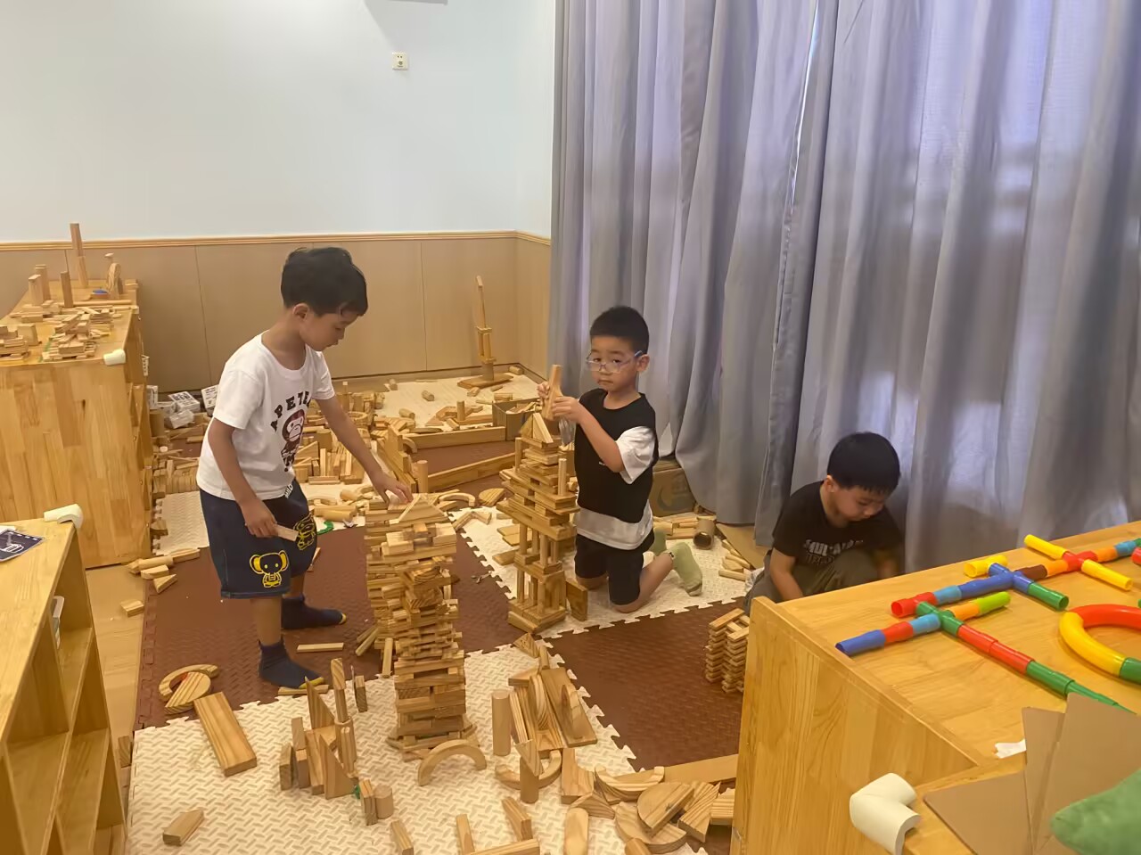 在建构区,小骞、浩浩、和小宁正在搭建作品。浩浩拿着一块积木,问旁边的小骞:“你觉得我们的城市需要什么样的建筑?”小骞想了想,回答:“我们应该建一个高高的塔楼,像未来城市里的那种。”浩浩点头表示赞同,开始动手搭建。不一会儿,他又问:“你觉得这个塔楼怎么样?够高吗?”小骞仔细看了看,说:“可以再高一点,我们再加几层吧。”于是,两人继续合作,一层一层地往上搭。搭建过程中,他们还讨论了如何设计城市的道路和交通。浩浩提议:“我们可以建一条环绕塔楼的大道,让车子都能方便地进出。”小骞觉得这个主意不错,于是他们开始动手铺设道路。经过一番努力,他们的未来城市终于搭建完成了,两人都感到非常满意和开心。