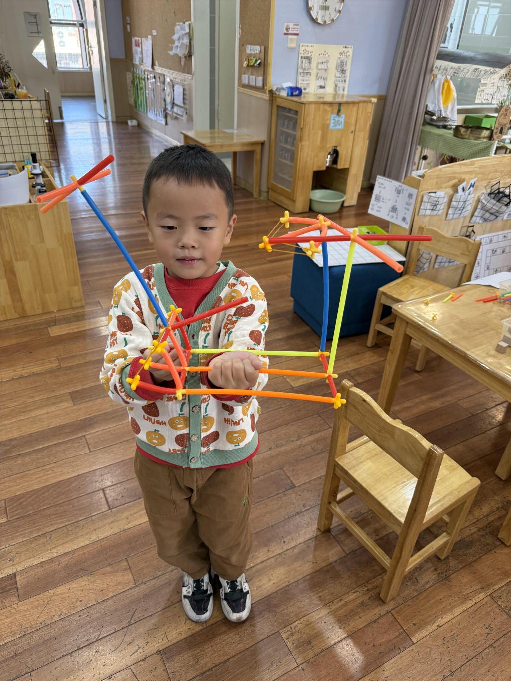 苏苏走到益智区,从材料筐里拿出彩色吸管和连接扣,蹲在地上开始摆弄。他先挑了一根蓝色长吸管,又拿了几根红色短吸管,用连接扣把红色吸管一端连在蓝色吸管顶部,另一端交叉固定,嘴里念叨着:“这是探测器的螺旋桨,要转得快才能探测到远处。”