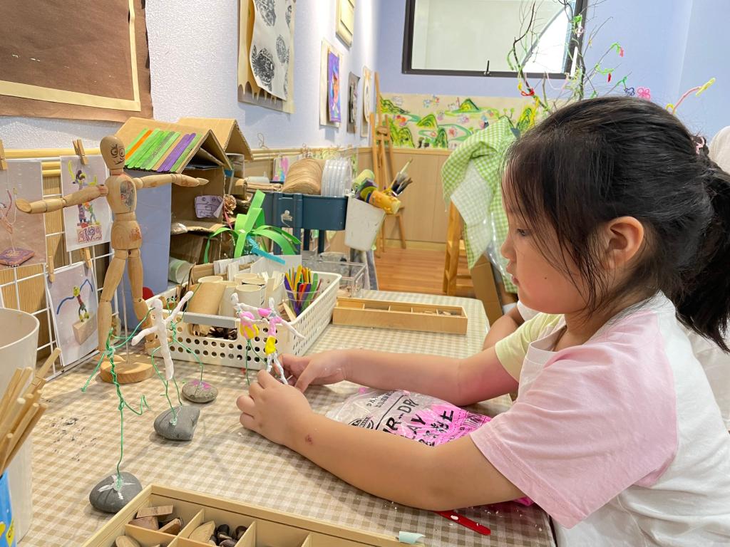 昕昕来到了美工区,他今天打算制作铁丝黏土人。这里摆放了几个扭好的铁丝人。他从彩色黏土盒里挑选黏土,先取了肉色的黏土,揉成大小合适的圆形,轻轻按压在铁丝人的头部位置,当作脸蛋。然后又搓出一点肉色的黏土开始搓成长条形。轻轻附在了铁丝人的四肢和躯干上“好啦,他的胳膊,我要给他捏个手。”昕昕说。他将黏土在铁丝人胳膊末端捏出手掌的形状。接着,他拿起粉红色黏土,开始压成扁扁的,“我要给他做一件粉红色的衣服,因为我喜欢粉红色的。”他把压扁的粉红色黏土小心地包裹在铁丝人的躯干上,还特意调整了黏土的边缘,让它看起来更平整。