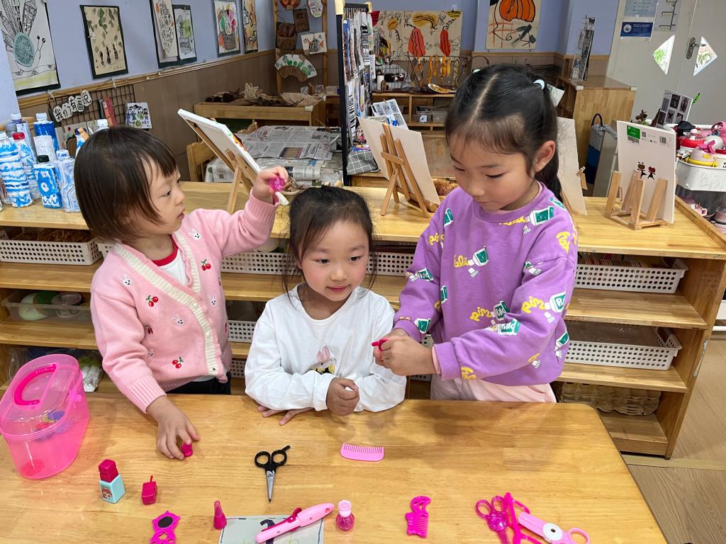 角色游戏时间,娃娃家区域的“美美美发店”迎来了三位创意满满的造型师——好好、芯言和苒苒。