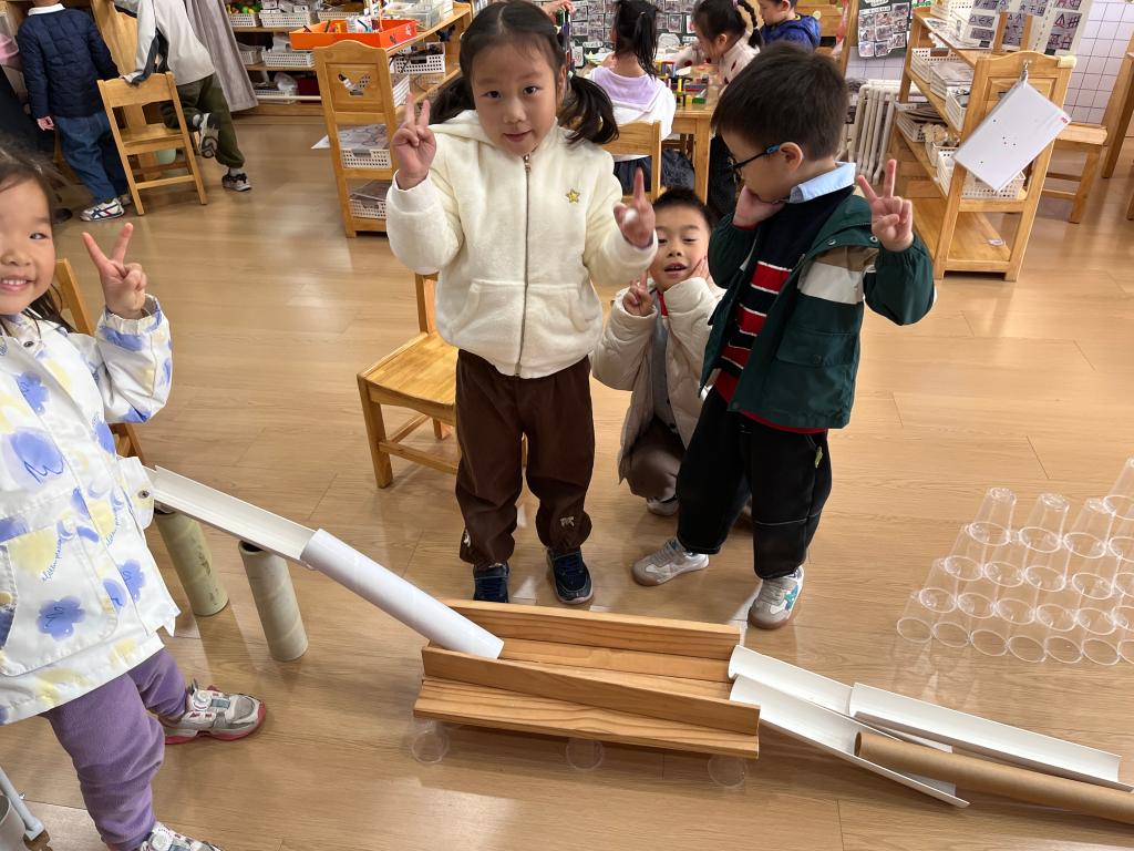 区域活动刚开始,熙熙、灏灏、宇辰和妤桐就抱着PVC管、纸杯围在了地板上——他们要搭一条“能让弹珠穿过的超级轨道”。