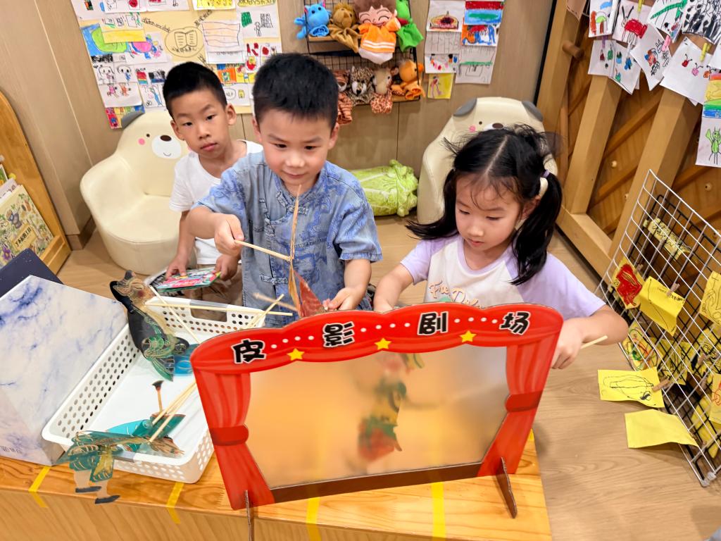 格格和可昕坐在阅读区的皮影戏台前,各持一根木棍操控皮影。格格手中的“小兔子”皮影左右晃动,她的另一只手扶着戏台边缘,身体微微前倾。可昕操控的“小老虎”皮影从戏台左侧移向中央,木棍在她手中转动,皮影的爪子上下摆动。“小兔子,你要去哪里呀?”可昕歪着头,眼睛看着戏台上的皮影,声音提高了半个音调。格格的右手将“小兔子”皮影向上提了提,皮影的耳朵随之竖起:“我要去找胡萝卜!”“嗷呜——小老虎饿了!”可昕突然将“小老虎”皮影向前推,皮影的嘴巴张合了两下。木棍在她手中快速抖动,皮影在戏台上跳跃了三下。格格把“小兔子”皮影向后拉,皮影的身体贴在戏台右侧的幕布上:“快跑呀!老虎来抓我了!”她的肩膀上下耸动,手中的木棍带动皮影左右躲闪。两人同时将皮影向上举起,幕布上的影子重叠在一起。格格和可昕相视一笑,手中的木棍继续移动,皮影在幕布上做出“走路”的动作。