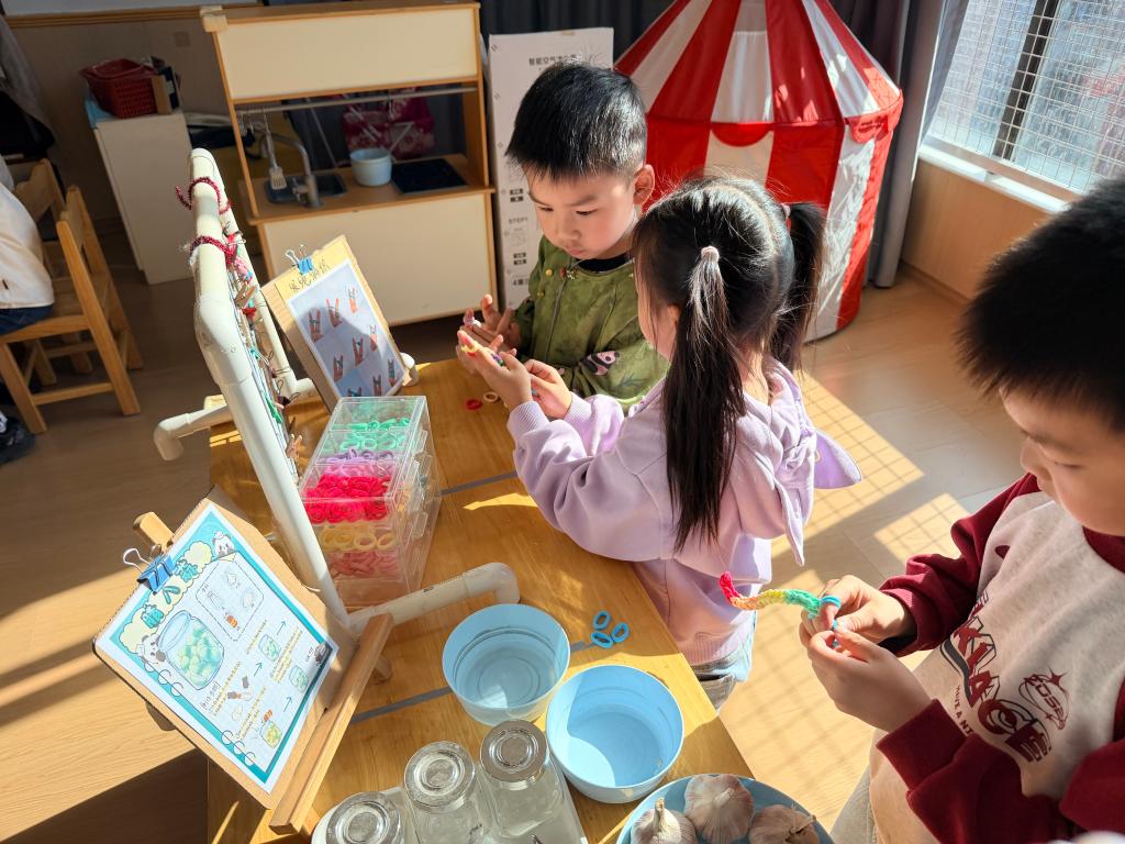 格格正在用绿色和黄色发绳编织,他的手链已经编出约5厘米长。他转头看到瑶瑶面前的发绳,停下手中的动作,身体微微前倾,说:“你看,要像这样把绳子分开。”他伸出左手,将自己的三根发绳分别夹在食指、中指和无名指之间,右手拿起最右边的绳子搭在中间的绳子上,边做边说:“这边的过来,压在中间。”瑶瑶看着格格的动作,也学着将自己的发绳夹在手指间,右手拿起右边的粉色发绳向中间搭去,成功完成了发绳的编织。